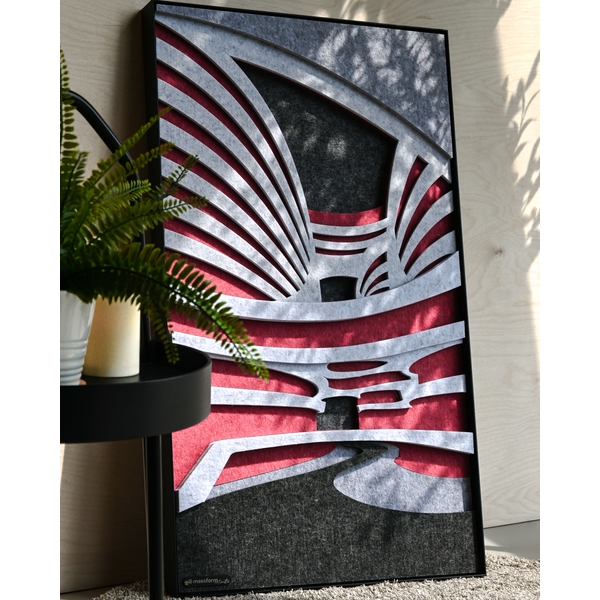 起初是為了解決室內設計客戶的需求,massform客製了一系列藝術化的吸音產品,像是吸音掛畫、壁燈和吊燈等,不僅具有卓越的吸音效果,還能與空間的設計完美融合,增添美學價值。2023年,將這概念進化延伸,開發出少量生產的聲學藝術壁畫,使客戶能夠更快速地選擇並使用到這些結合高度實用性與設計感的產品。