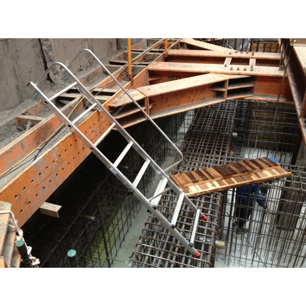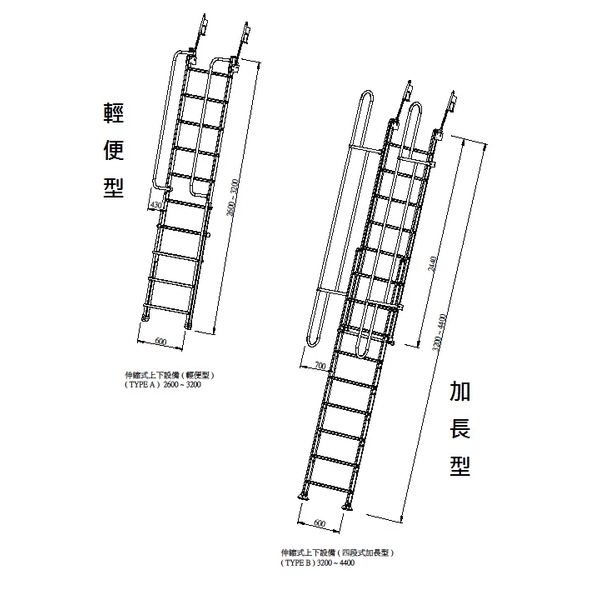 本設施利用上段扶梯、下段扶梯之間可伸縮延長的特性,可有效利用於各種高度及深度不一的施工環境,無須事先規劃架設空間,隨時可以架設使用;上扶梯端部之固定裝置搭配下段扶梯端部之止滑元件,使本創作更加穩固不易傾倒,大大改善了習知技術的缺點;本設施極適用於地下室開挖作業及大底版結構體施工時,作業人員上下設備使用。