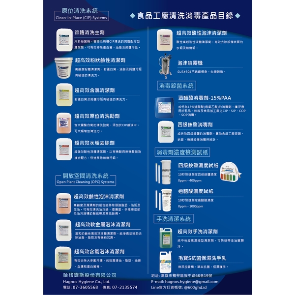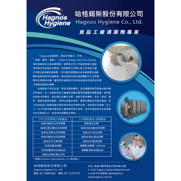 「Hagnos哈格?斯」源自於希臘文,代表「純潔、聖潔、樸素」,Clean is Always the First Priority 是哈格?斯的企業品牌標語,我們每天的工作就是幫客戶創造潔淨衛生的食品安全環境。哈格?斯公司專心致力於食品工廠CIP原位清洗管路清潔劑、OPC開放空間清洗泡沫清潔劑及消毒劑的創新研發與生產製造。擁有超高效複合清潔劑配方以及長期穩定的原物料供應,讓我們在協助客戶有效完成清洗及降低成本兩方面都有極佳的優勢。