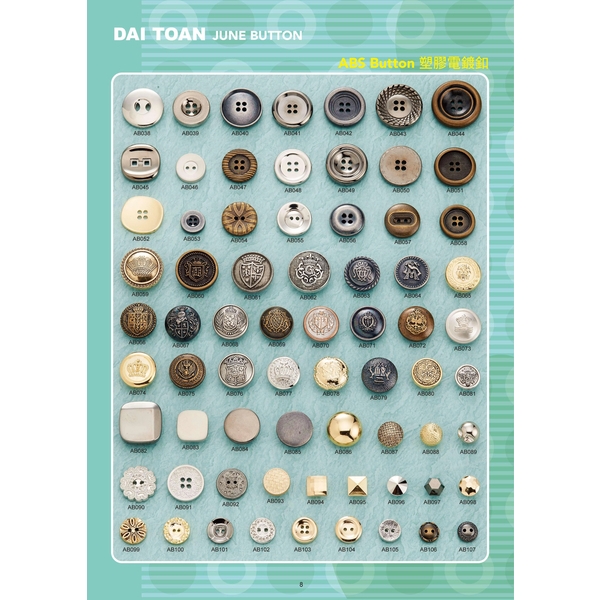 本公司主要產品包括:波麗鈕釦、塑膠電鍍扣、真貝鈕釦、椰子鈕釦、木釦、牛仔立釦、金屬鈕釦、四合扣、雞眼、水鑽扣、壓克力鈕釦及其它服飾配件等。