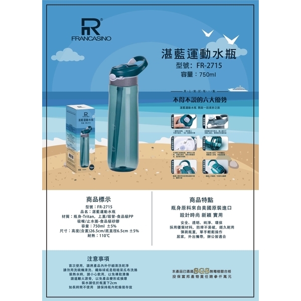 【FRANCASINO】湛藍運動水瓶750ml FR-2715【FRANCASINO】湛藍運動水瓶750ml FR-2715
