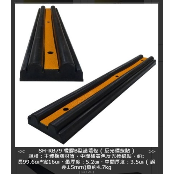 規格:主體橡膠材質,中間橘黃色反光標線貼,約:長99.6㎝*寬16㎝、最厚度:5.2㎝、中間厚度:3.5㎝ ( 誤差±5mm)重約4.7kg