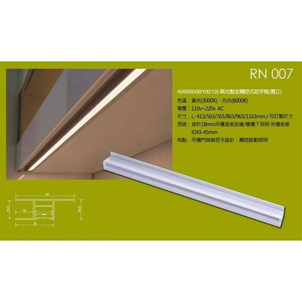 用途: 崁於18mm 吊櫃底板前緣, 櫥櫃裡下照明及玻璃吊櫃內部照明 吊櫃底扣43-45mm