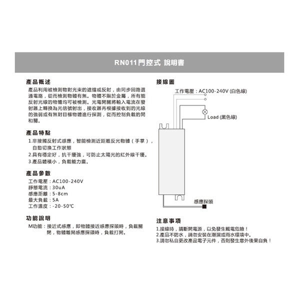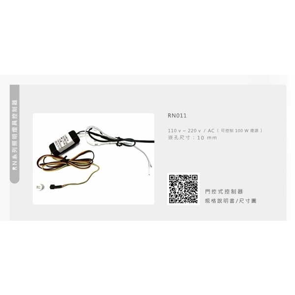 RN011 門控式控制器、門控開關或門控感應器: 打開櫃門當衣櫃、酒櫃或系統櫃的門片被打開時,內部的感應器會偵測到門片移動,立即啟動 LED 燈條。關閉櫃門當門片關上時,燈光會自動熄滅, 直接安裝在櫥櫃門板的後方或內部,其作用僅限於控制單一或一組燈光的開關。110v ~220v / AC (可控制100W 燈源)