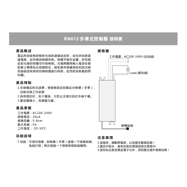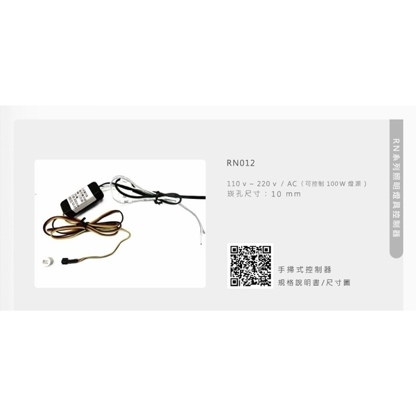 RN012 手掃式控制器,感應開關的核心是利用 紅外線感應器,來偵測手部在感應區域內進行的動作, 應用於櫥櫃、廚房、浴室鏡櫃等場所的非接觸式感應開關, 提供了一個衛生且方便的開關方式,讓使用者不必觸摸開關就能控制燈光。110v ~220v / AC (可控制100W 燈源)
