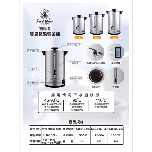 功能特色: 具備智能溫控(45-110°C)、防燙側把手、防燙上蓋把手、水位表及#304 不鏽鋼水龍頭等設計