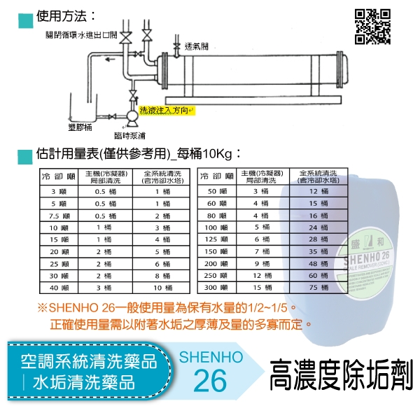 專門針對已形成的水垢,能在最短的時間內,予以溶解洗淨,恢復冷凝器及熱交換器的熱傳效能水在冷卻系統中,使用一段時間後,其所含的雜質會沉析附著在冷凝器、熱交換器及管路裡面,形成水垢,使熱交換效率降低,浪費能源,甚至影響到空調冷氣跳車,工廠產能低下等嚴重後果。SHENHO 26是專門針對已形成的水垢,能在最短的時間內,予以溶解洗淨,恢復冷凝器及熱交換器的熱傳效能。