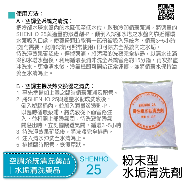 SHENHO 25為粉末有機酸之水垢清洗劑,含有特殊腐蝕抑制劑,絕不腐蝕銅、鋁等金屬及其合金材質之設備,對於碳酸鈣為主的水垢,具有極優之溶解性,可以完全洗淨水垢,對於某些特殊材質,如不銹鋼,鈦金屬以及含鉻、鎳之合金鋼等不能用鹽酸來洗淨之設備,可以使用SHENHO 25予以洗淨,而不必擔心應力腐蝕之發生。
