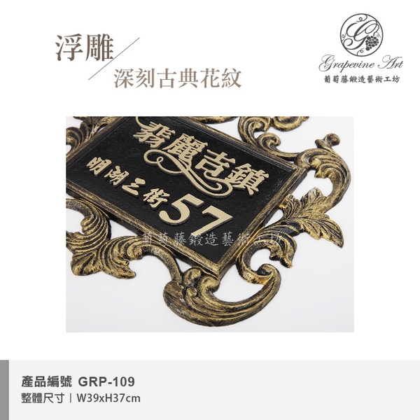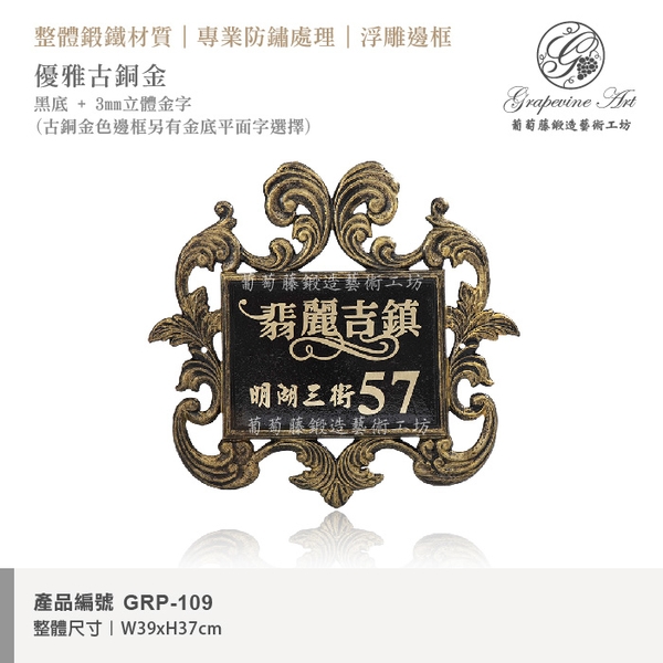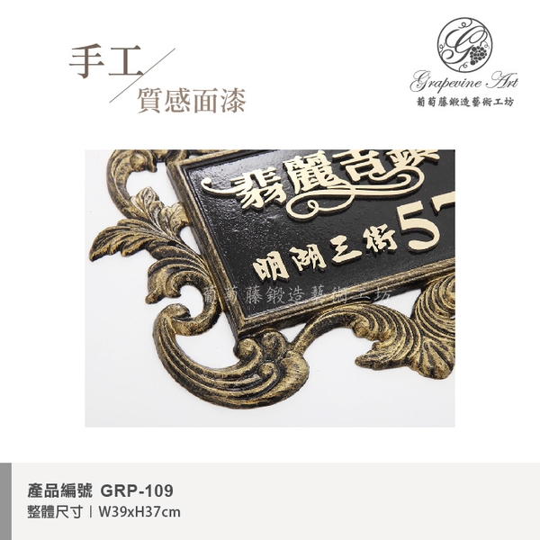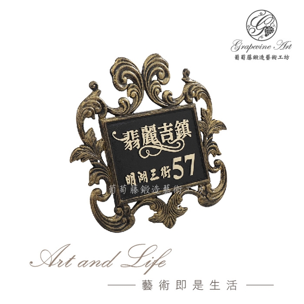 精緻高質感的鍛造鍛鐵門牌。個人訂製,量身打造您專屬的精品門牌。年銷千片,高品質千萬豪宅建案,高等級住宅區,社區管委會,室內設計師,及公家機關等大批採購。葡萄藤的鍛造鍛鐵都有防鏽處理,皆是置於戶外材質,整體實心鍛造鐵材,不同於大陸空心管製品。台灣製的驕傲商品。