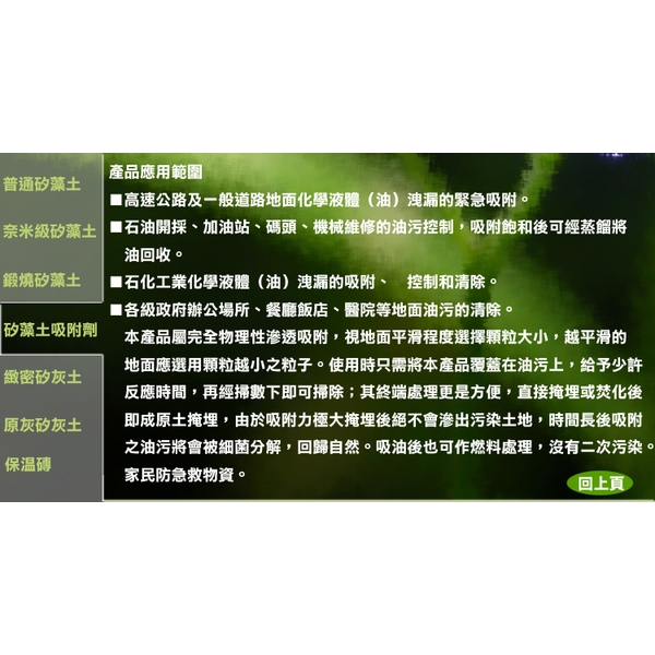 取材於純天然綠色材料,其微孔结構非常適合微生物的寄居,少量吸附油後飽和的矽藻土可以直接撒在草地上,油將自然地被微生物分解,成為良好的土壤改良資材。
