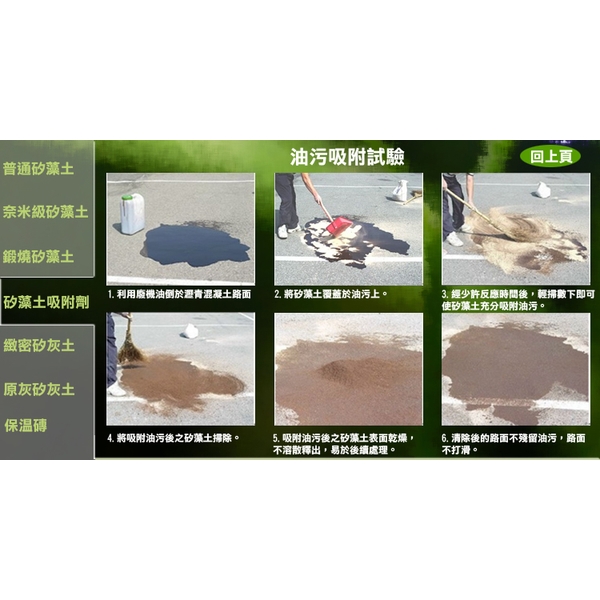 使用時只需將本產品覆蓋在油汙上,給予少許反應時間,在經掃樹下即可掃除;其終端處理更是方便,直接掩埋或焚化後即成原土掩埋,由於吸附力極大掩埋後絕不會滲出汙染土地,時間長後吸附之油汙將會被細菌分解,回歸自然。