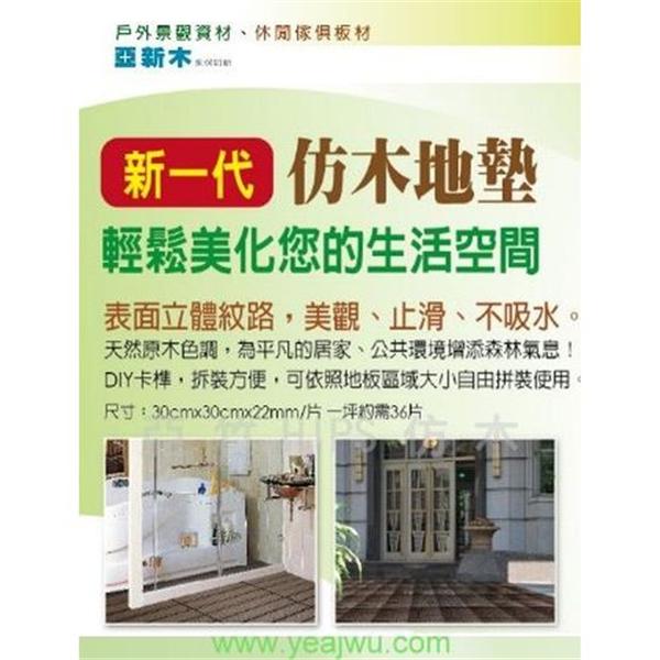 1.百分百仿木─四面仿真立體木紋表面,無塑膠光澤,產品外觀與實木接近,具有高級實木外觀及質感。產品剛性佳不怕水,優於PE、PP、PVC合成木,不需防腐便可直接使用。不添加會吸水、會腐敗、不穩定的木粉木屑,植物纖維或甚至廢棄料,料質不混雜,材料回收後可以還原再利用。