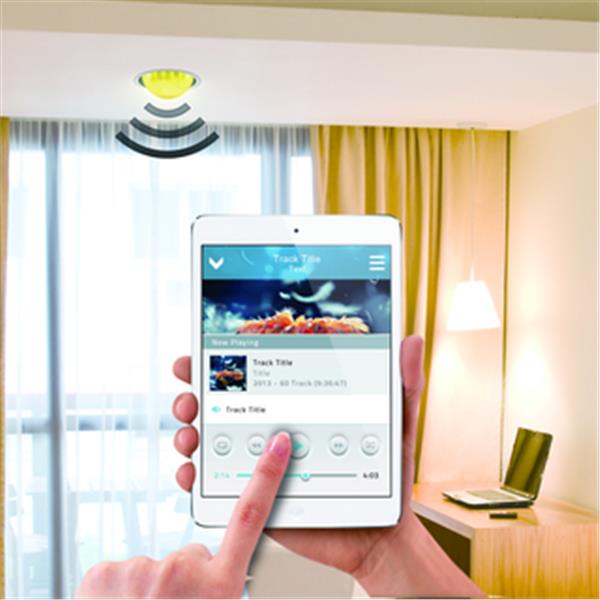 可透過藍芽的連線, 使用手機/平板上app的軟體來遙控LED的開關/明暗度調整及音樂的播放