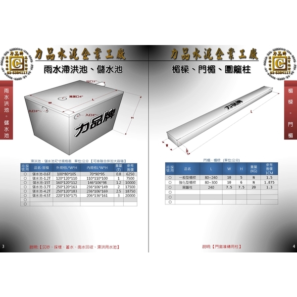 新竹第一家建築物汙水處理設施,經內政部與環保署審核通過,營業項目有污水處理槽、水泥管、截油槽、滯洪池、雨水池、各類鑄鐵蓋、各類鍍鋅蓋、RC污水槽、FRP污水槽、RC儲水槽、傳統化糞池、水泥柱、水泥製品、陰井、電信手孔、電信人孔、電力人孔、水箱、欣昌、力品牌預鑄式RC認證污水處理槽、井圈、門樑、活動廁所、FRP化糞池、PE傳統化糞池、PE水塔池、高壓管、高壓人孔、低壓人孔,規格齊全、種類多樣,請來電洽詢由專人為您服務品牌 : 力品牌