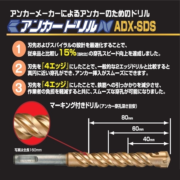 日本三幸(Sanko Techno)製造 最佳的4×4溝槽設計 使鑽孔及退土速度大幅上升型號 : アンカードリル ADX-SDS