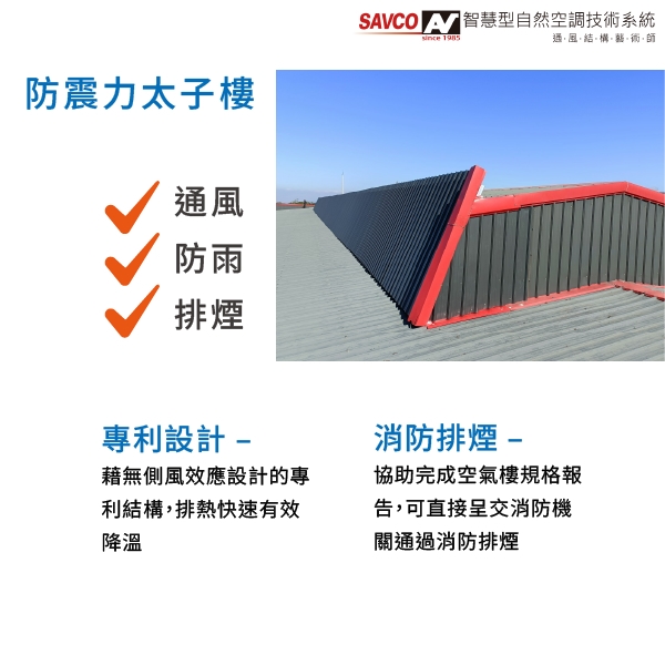 防震力公司全方位推廣節能減碳 並極力為客戶設計規劃良好舒適的工作環境,設計免動力通風散熱技術 通過美國、中國、臺灣之發明專利 獲得 2013年臺北國際發明競賽 及 2014美國匹茲堡國際發明競賽 建築類兩項銀牌獎。 今年度最新產品-排熱強採光型,美國同步上市中,顛覆你對通風散熱的想法 五倍以上驚人出風量,終結所有螺旋通風球的缺點。 輕鬆創造更快速便利與安全的通風環境,終生免維修保養、安裝容易、完全不用電。