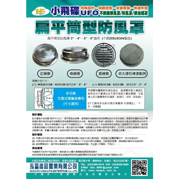 3.(小飛碟)主要產品不銹鋼: 排煙罩、防颱型防風罩、方形排風罩、外氣口、排氣罩、出風口、防風雨罩、溢水口、防颱型排氣罩、外牆排風罩、不銹鋼透氣罩VTR、熱水器強制排氣罩、排風罩、魚眼罩、通風口、排煙罩、鋁箔軟管、防雨罩、3向防風罩、排風口、防風罩、外氣罩、筒狀排氣口、內牆溢水口、逆止風門排風罩、溢水口修飾蓋、鋁自由管、外牆溢水口、收邊修飾套環、不銹鋼平面方形外氣口、逆止閥、不鏽鋼平面圓形外氣口、外牆排氣罩、廚房排風罩、排油煙機專用逆止風門.....固定使用不銹鋼304材質、不生銹、不腐蝕、不氧化,歡迎測試比較,專業台灣製造、大樓對外排風口產品、排氣罩裝置,也承蒙業界 及 知名建商指定使用--- 歡迎 ˙ 多多指教~感謝業界支持!!