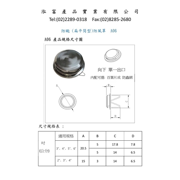 產品文件 : 防颱(扁平筒型)防風罩-A06、筒狀排風罩、排風罩、排氣罩、立體圓型防風罩、柱型防風罩、防風型、排風罩、防颱型、外氣口、排煙罩、外牆排風罩