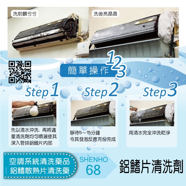 適用於鋁質之鰭片、管排、散熱器、過濾器等空調冷凍設備之清洗/不損傷銅、鐵、鋁之金屬表面空調冷凍設備之管排鋁鰭片,常因集附塵埃、污垢造成阻塞。而減少通風量,降低熱交換率,影響冷房效果,需消耗更多電力,浪費能源。在工業上則更會使產品品質降低,產量減少。