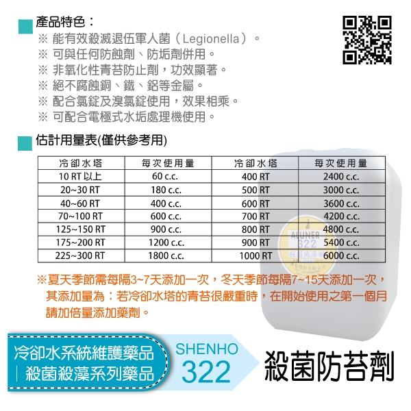 ALUNER 322殺菌防苔劑屬於非氧化性,適用範圍極廣,在任何pH值的冷卻水中均能完全發揮其功效完全控制藻類苔類,真菌類,孢子類黴菌等細菌之繁殖,而防止冷卻系統中青苔及粘泥的產生,且能防止退伍軍人症之散播。