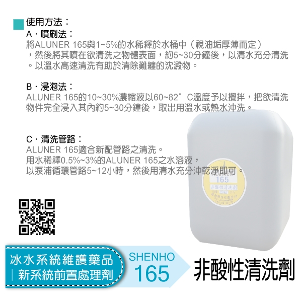 3 清洗管路:ALUNER 165適合新配管路之清洗。用水稀釋0.5%~3%的ALUNER 165之水溶液,以泵浦循環管路5~12小時,然後用清水充分沖乾淨即可。