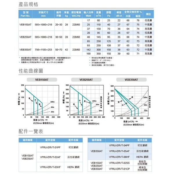 台達PM2.5直流變頻全熱交換器系列VEB150AT、 VEB250AT、 VEB350AT,超薄型機身,節省安裝空間,節能DC直流電機,高效三重過濾網,有效過濾霧霾有害成分PM2.5,淨化效果高達97%,可搭配智能控制盒,自動監測室內空氣質量(PM2.5, CO2)、並自動啟動換氣,定風量控制,規格管道長度內,末端送風量不耗減,微正壓設計。便利檢修蓋,三種規格,可依使用空間大小需求做選擇。型號 : VEB350AT