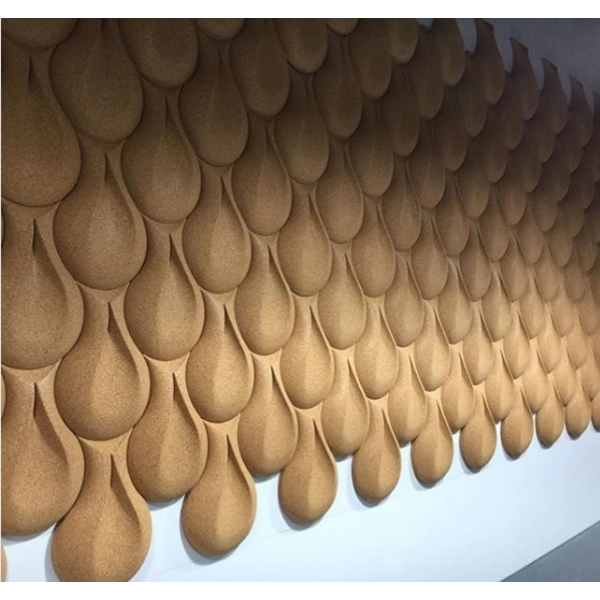 以軟木拼出室內牆面設計。來自葡萄牙,採用最新成型技術,將軟木製成獨特有機造型,所有產品皆整體著色,非表面著色,展現軟木的天然質感及獨特紋理。