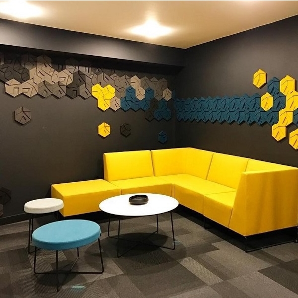以軟木拼出室內牆面設計。來自葡萄牙,採用最新成型技術,將軟木製成獨特有機造型,所有產品皆整體著色,非表面著色,展現軟木的天然質感及獨特紋理。