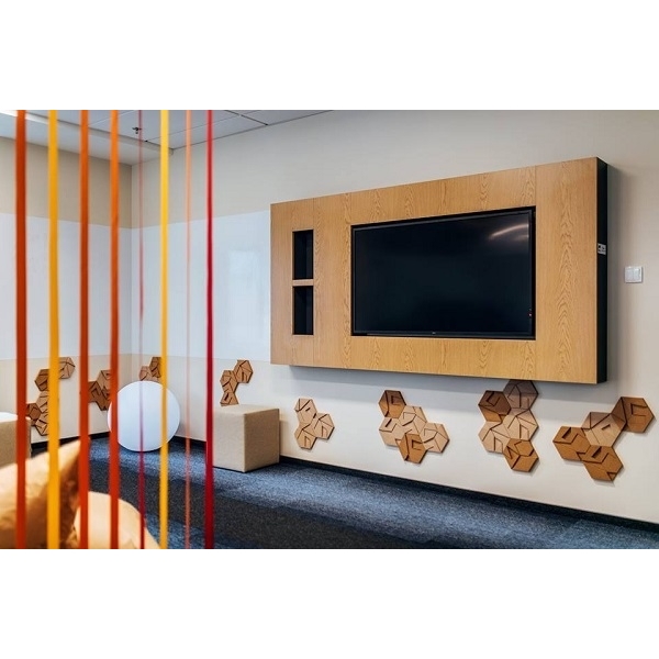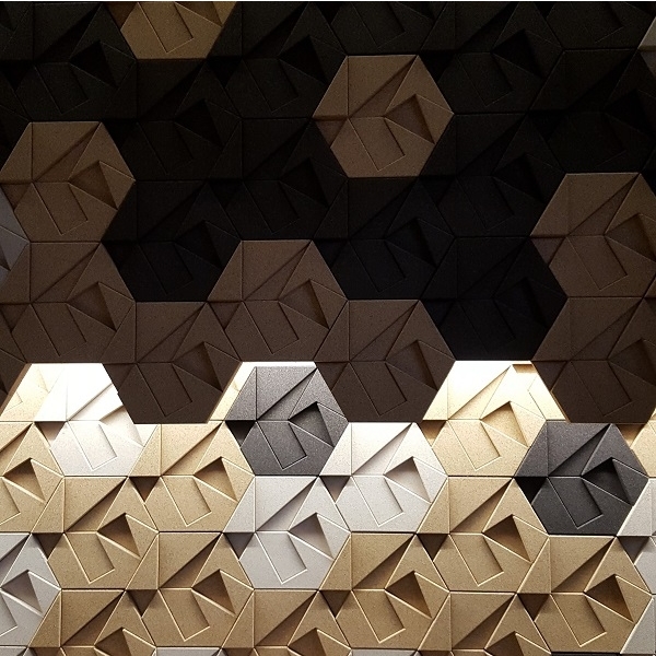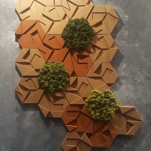 以軟木拼出室內牆面設計。來自葡萄牙,採用最新成型技術,將軟木製成獨特有機造型,所有產品皆整體著色,非表面著色,展現軟木的天然質感及獨特紋理。
