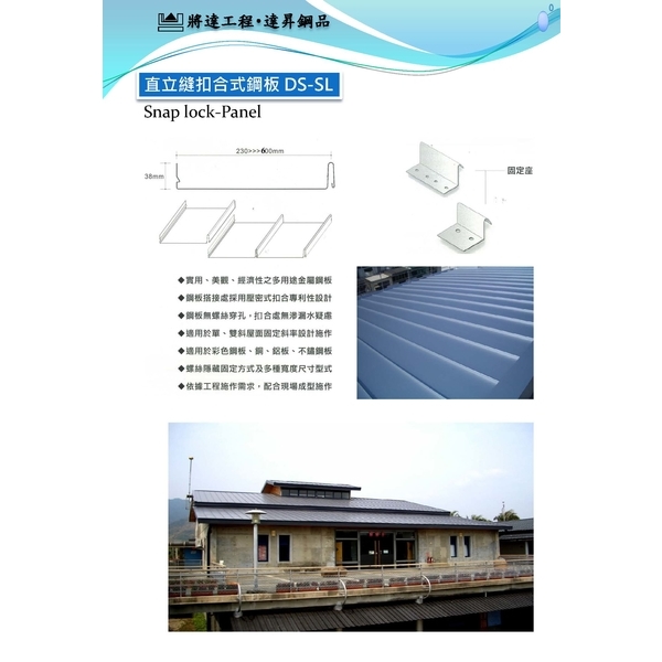 達昇鋼品有限公司成立於民國80年,是一家多元化的企業,為求工程實務經驗與產品、設計等結合,於民國95年成立達昇鋼品有限公司,致力推動多項金屬屋面及牆面建材與設計,更結合來自歐洲、日本等嶄新金屬建材、新工法等多項技術,整合出更完善服務體系,無論是高科技電子廠、公共工程金屬板、3D異象造型屋牆面板等,皆為本公司專業領域!