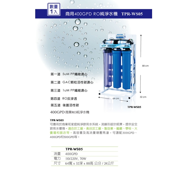 ◎品名/型號:泰浦樂 Toppuror TPR-WS05 商業RO純淨水機400GPD◎品名/型號:泰浦樂 Toppuror TPR-WS05 商業RO純淨水機400GPD