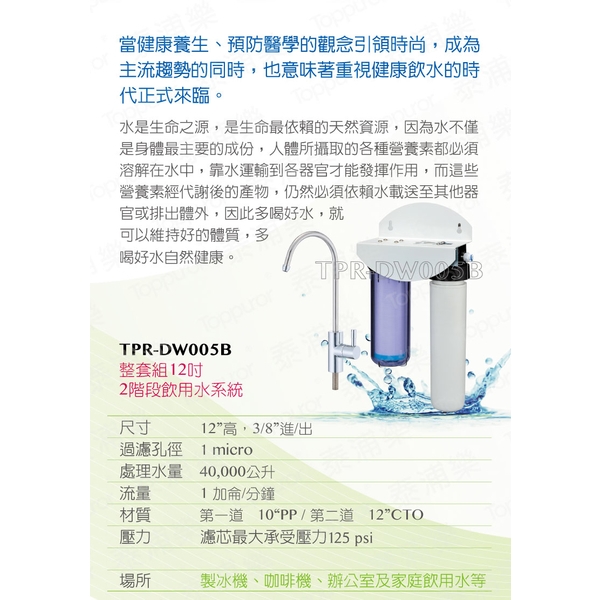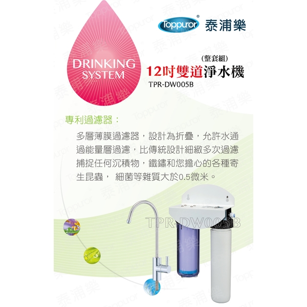 ◎品名/型號:【泰浦樂 Toppuror】12吋雙道生飲淨水機(整套組)TPR-DW005B