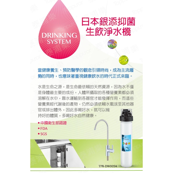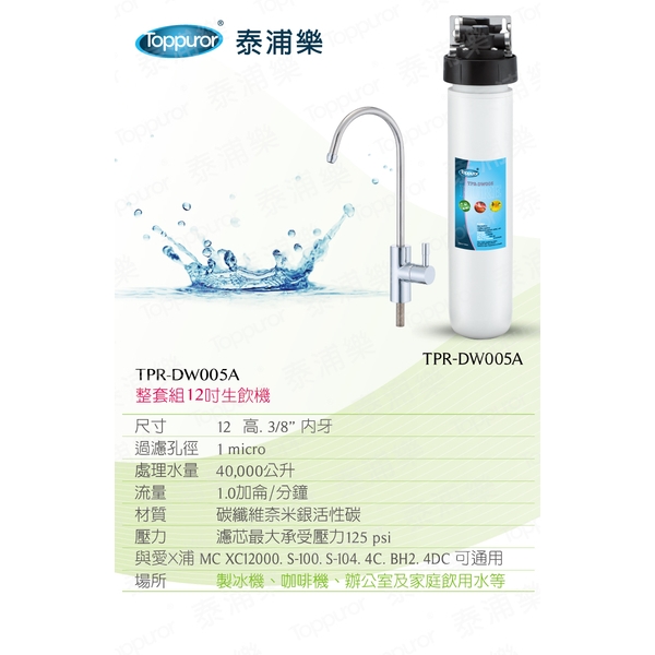 ◎品名/型號:【泰浦樂 Toppuror】12吋單道生飲淨水機(整套組)TPR-DW005A