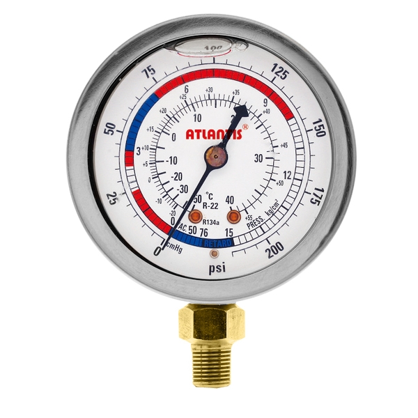 F-L 指針式冷媒錶內部填充流體,採冷媒專用面板,適用多種冷媒量測,廣泛用於各種冷凍系統壓力量測,如空調、冷媒填充設備等。
