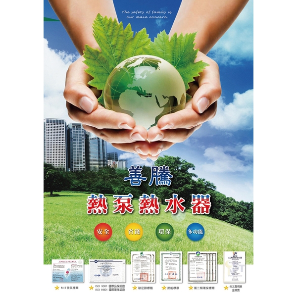 熱泵熱水器是利用壓縮機把環境中的熱空氣吸進來燒熱水,而把製熱過程所產生的冷空氣排出去,為節能環保又安全的的熱水系統,耗電量約為電熱水器的25%。而善騰熱泵熱水器,為國內熱泵第一大廠,同時擁有環保節能標章及MIT台灣製造微笑標章雙認證,並取得全世界多國專利,是最棒的選擇唷 !
