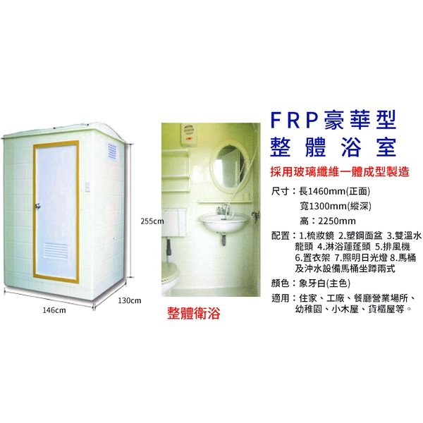 配置:梳妝鏡、塑鋼面盆、雙溫水龍頭、淋浴蓮蓬頭、排風機、置衣架、照明日光燈、馬桶及沖水設備馬桶坐蹲兩式