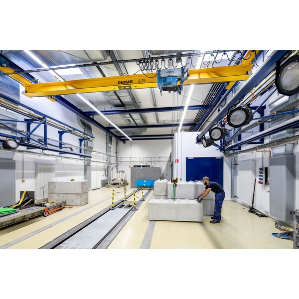 標準架空移動式起重機(懸吊型起重機):在建築物無拖架設計下,使用此起重機搬運高達 6.3 噸的負載重物。品牌 : 德馬格(Demag)