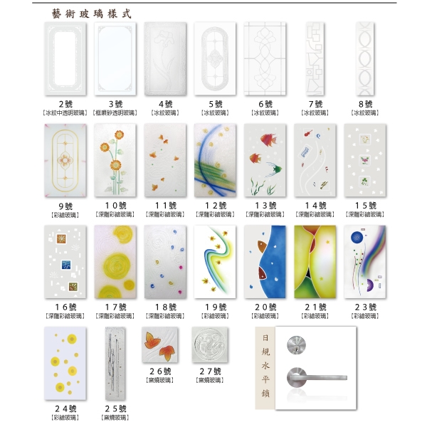 門斗:B14公分線板單用框 門片厚度:3公分 門片:鋁板+藝術玻璃門 [藝術玻璃]11號5m一般深雕彩繪玻璃 搭配鎖具:日規水平鎖