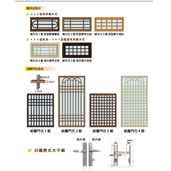 門斗:B防盗門框 開天花2號防盗管和式型(附2m透明PC版) 門片厚度:3公分 門片:鋁圓門花系列紗網紗門 [門花]上:鋁圓門花4號+紗網 搭配鎖具:白鐵匣式水平鎖