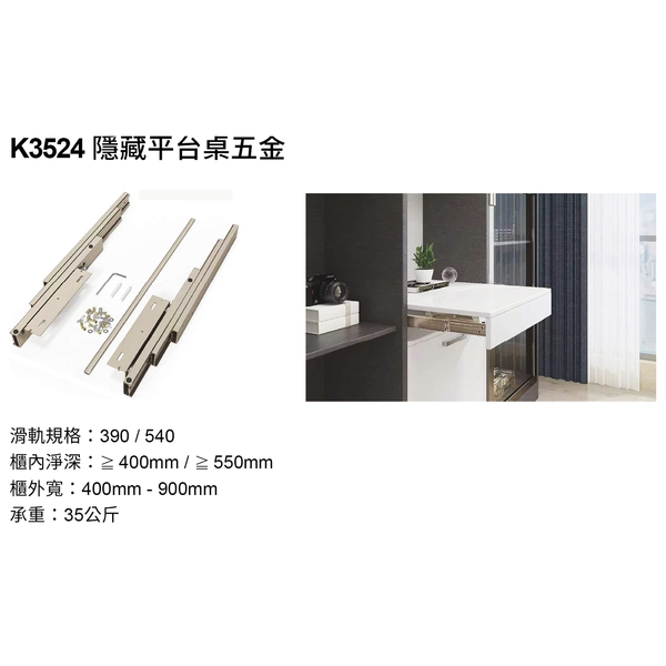 隱藏平台桌五金,提供穩定且靈活的解決方案。選用高品質滑軌(390/540規格),搭配櫃內深度達400mm/550mm,無論是小型或大型櫃體均能完美適配。櫃外寬度範圍為400mm-900mm,適應各種空間需求。每組滑軌設計承重高達35公斤,確保長期使用穩定可靠,無需擔心超載問題。選擇我們的隱藏平台桌五金,讓您的空間更具現代感與實用性,提升辦公環境的整潔與美觀。