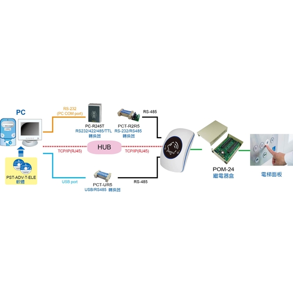 •經由串列輸出(RS-485或電晶體),搭配多點輸出繼電器盒(8F/24F/48F/64F/96F)可做電梯樓控管制。