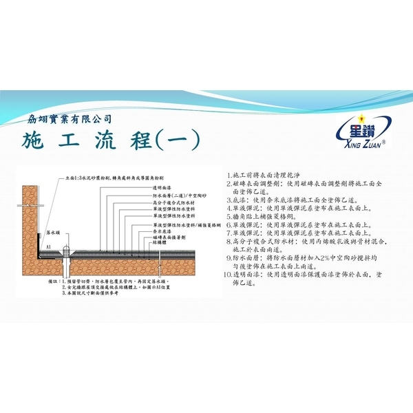公司以專業的技術生產水性防水材、水性壓克力球場材、水性樹脂砂漿地坪材、水性聚氨酯、矽酸質防水粉、天然彩砂、自黏熱熔式防水毯、水性奈米底漆、強化底漆、外牆油漆、耐黃變透明漆、磁磚表面接著劑、,主要銷售對象為盤商、大型賣場及工程材料行。