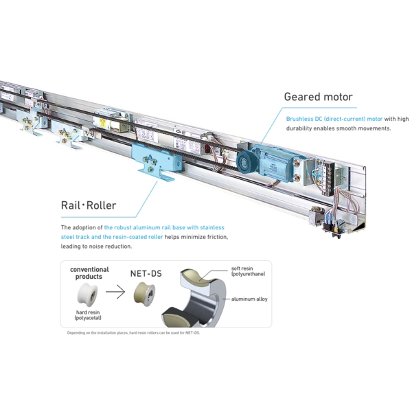 帶有此商標的自動門裝置是,在滿足JIS安全標準的前提下,始終追求安全性且符合未來標準的自動門。 另外,還顯示了使用CAN通訊的網路系統支援。