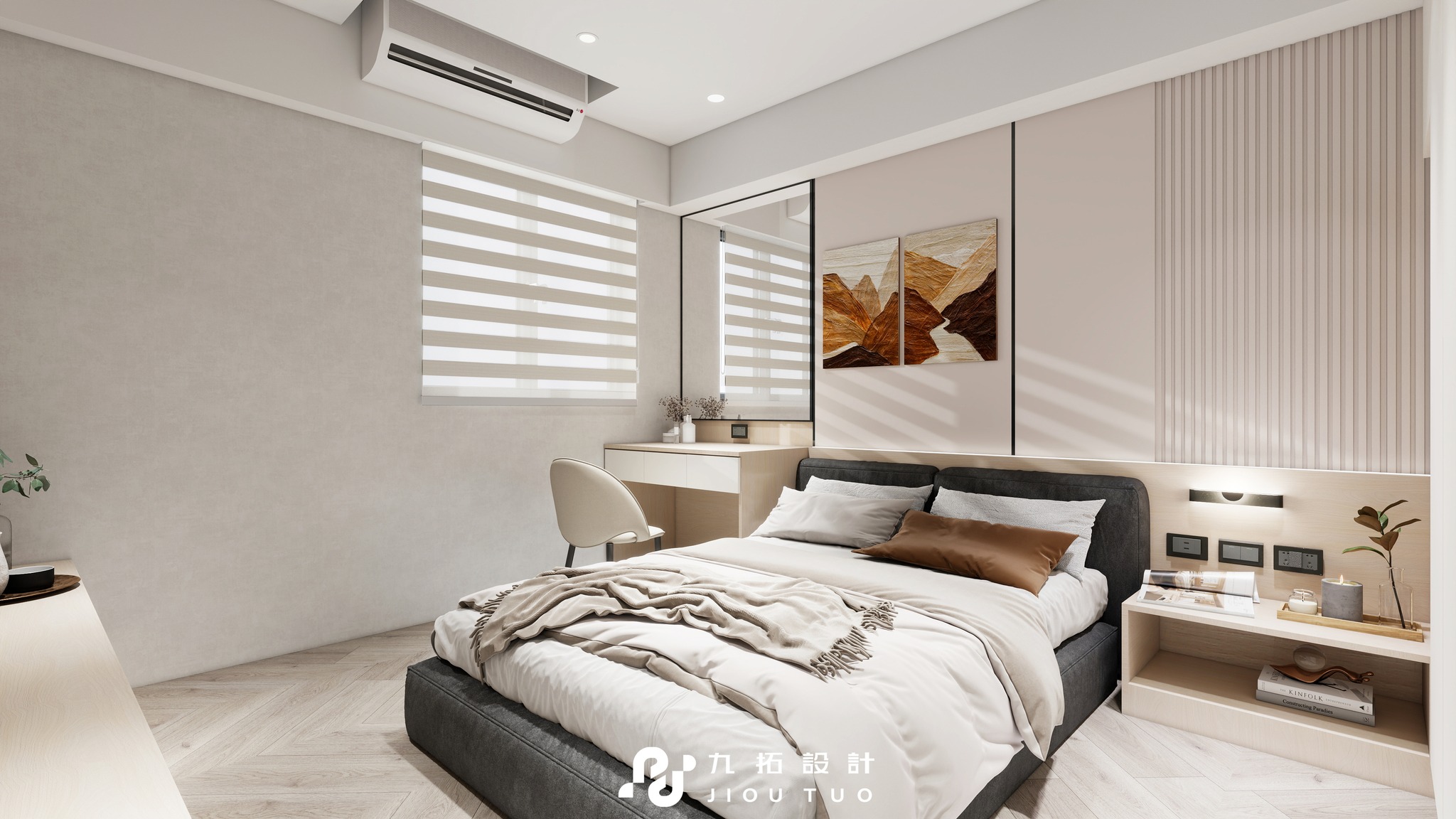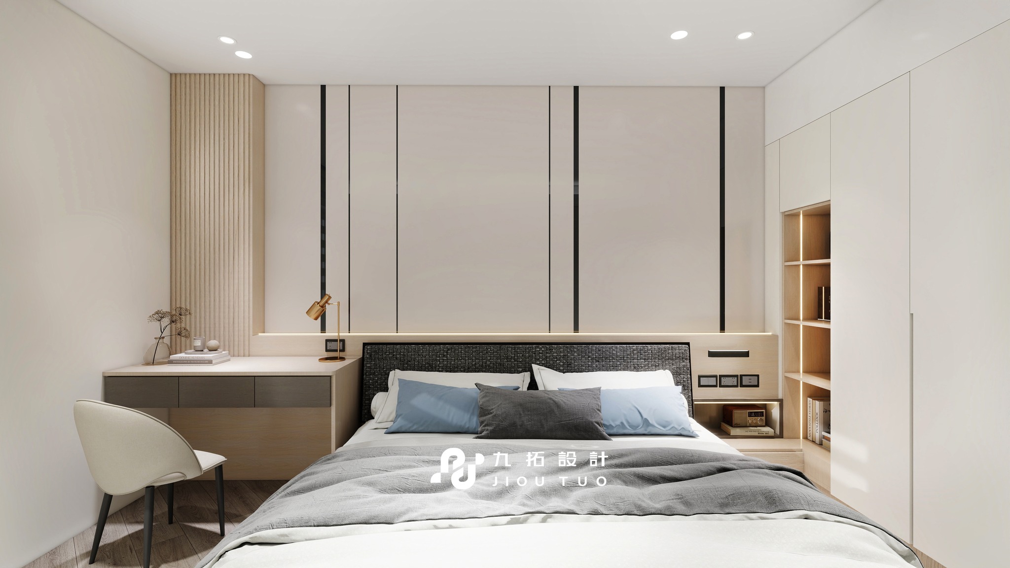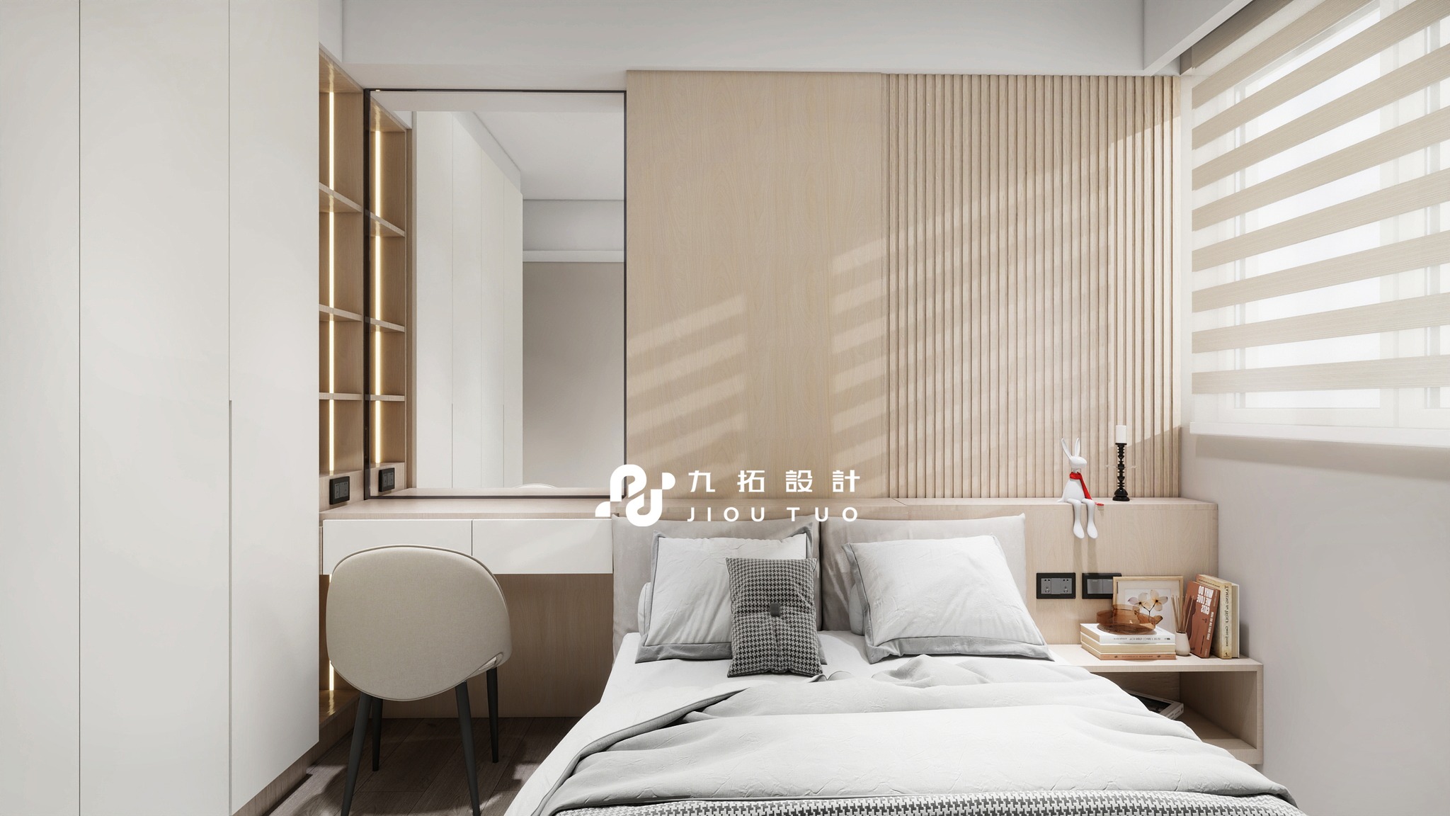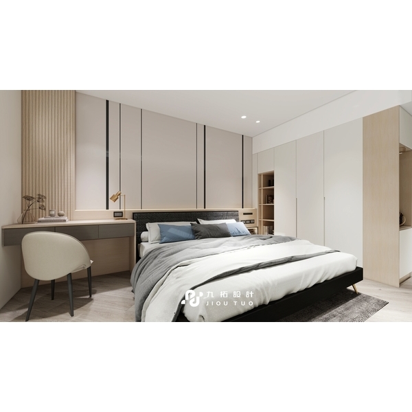 進門映入眼簾的是灰白色格柵電視牆,搭配同色系板材設計,與木質電視櫃相得益彰。大面積的鏡面書桌不僅實用,還能放大視覺空間。床頭背板與床頭櫃採同色系設計,搭配側櫃燈光,營造質感與溫馨的居住體驗。