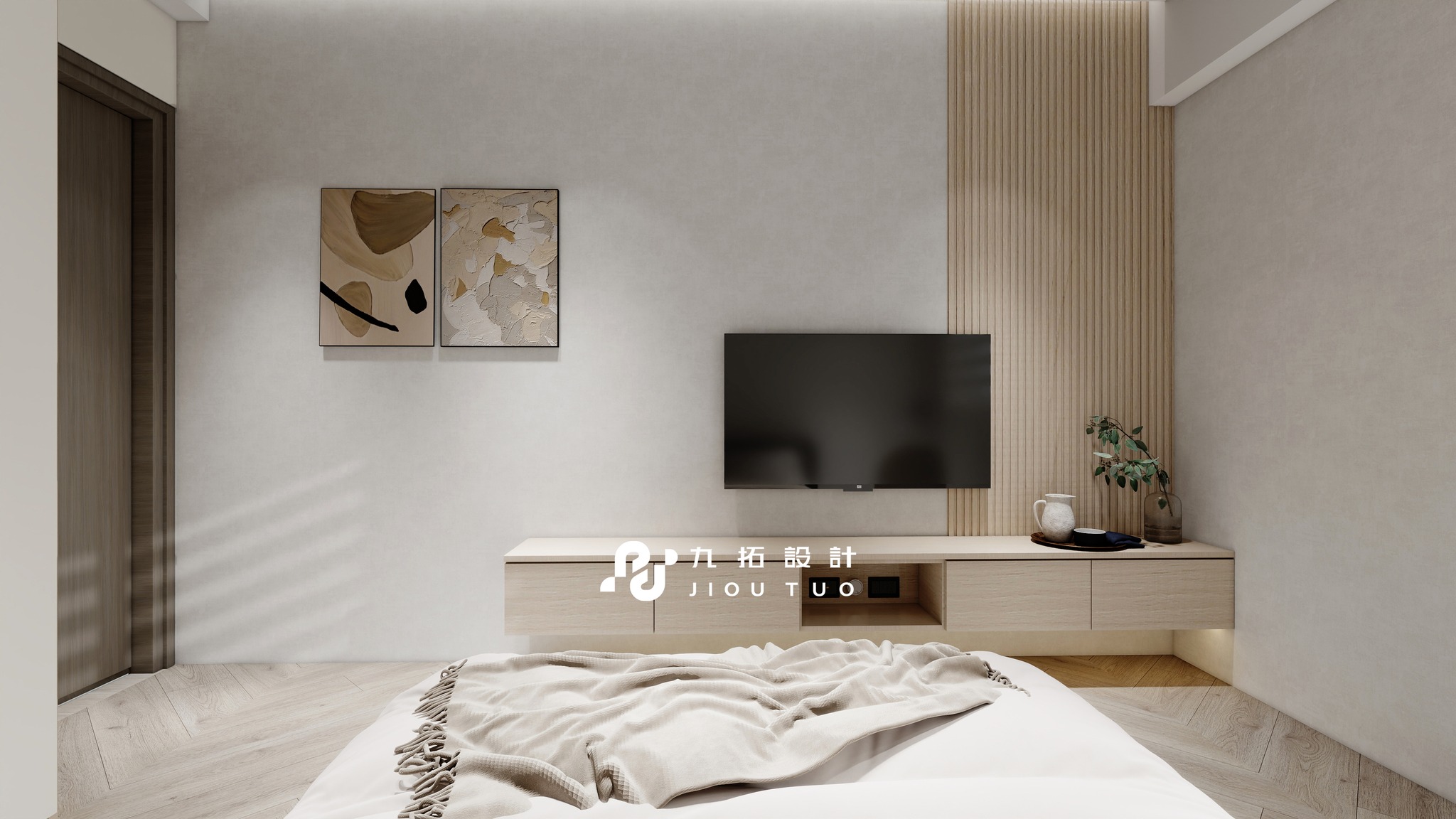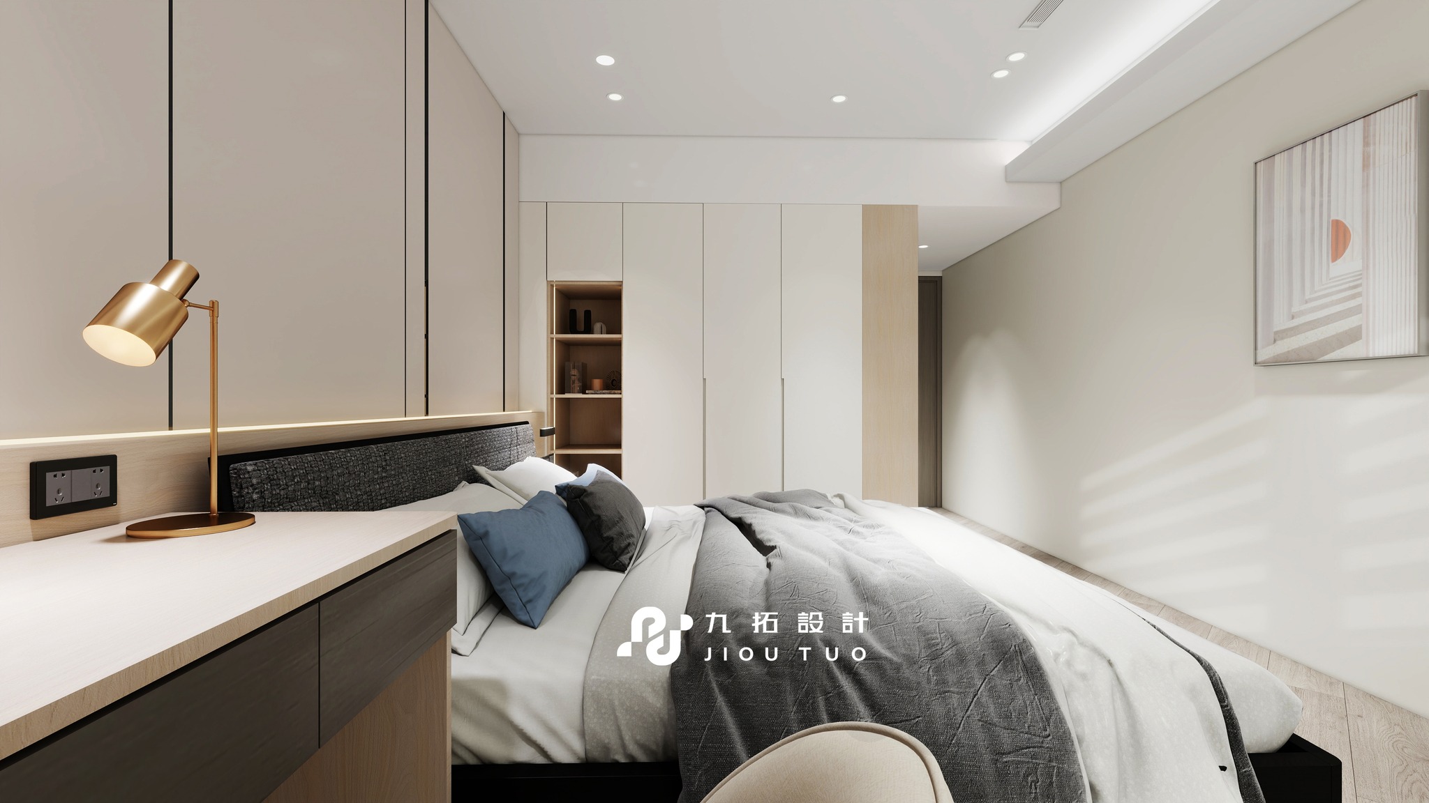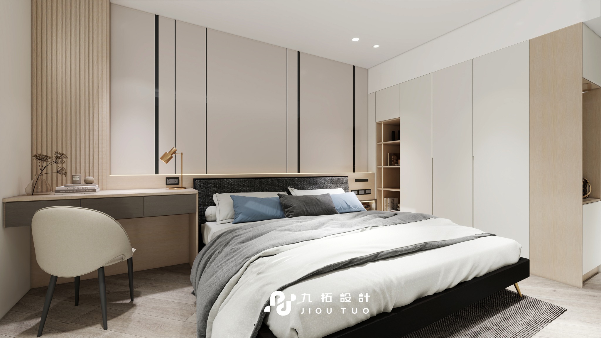 進門映入眼簾的是灰白色格柵電視牆,搭配同色系板材設計,與木質電視櫃相得益彰。大面積的鏡面書桌不僅實用,還能放大視覺空間。床頭背板與床頭櫃採同色系設計,搭配側櫃燈光,營造質感與溫馨的居住體驗。