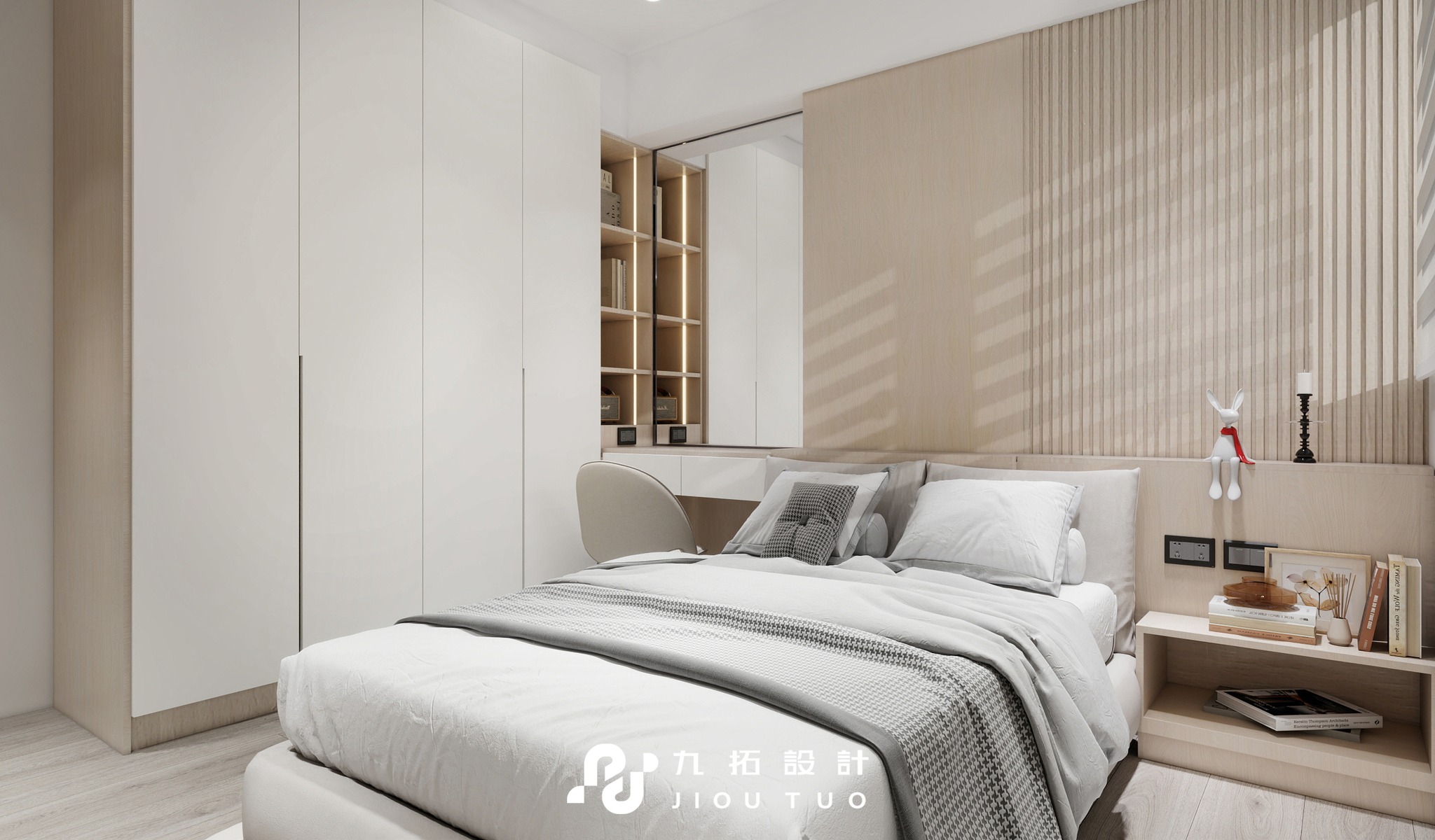 背景牆採藝術塗料與木格柵結合,細節精緻,搭配藏燈設計的木質床頭背板,與白色格柵和鏡面巧妙融合,整體空間呈現簡約卻不失層次的美感。燈光設計進一步提升舒適感,讓這間臥室成為現代感與溫暖氛圍兼具的私密空間。