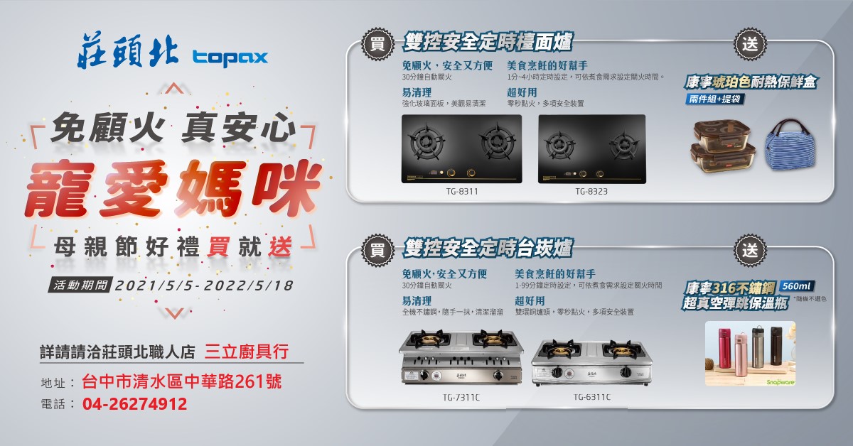 2022-05-05母親節好禮買就送!歡慶母親節,買爐就送好禮~ 寵愛媽咪,免顧火真安心~ 活動期間:5月5日到5月18日 詳情請洽:三立廚具行(莊頭北職人店) 地址:台中市清水區中華路261號 電話:04-26274912 返回列表 2025-03-31海爾母親節優惠活動,潔淨便利的好水生活,活動期間4/1~5/31,活動詳情請來店詢問!2024-07-02買櫻花RO淨熱飲送濾心2024.06.28🎉歡迎參加櫻花廚下RO雙溫淨熱飲新品上市活動!🎉2024-01-11★活動時間2024/1/5(五)~2024/1/31(三),購買全戶淨水FH-200享8折優惠,(加贈)美國黑科技-寵愛杯、基本安裝!
