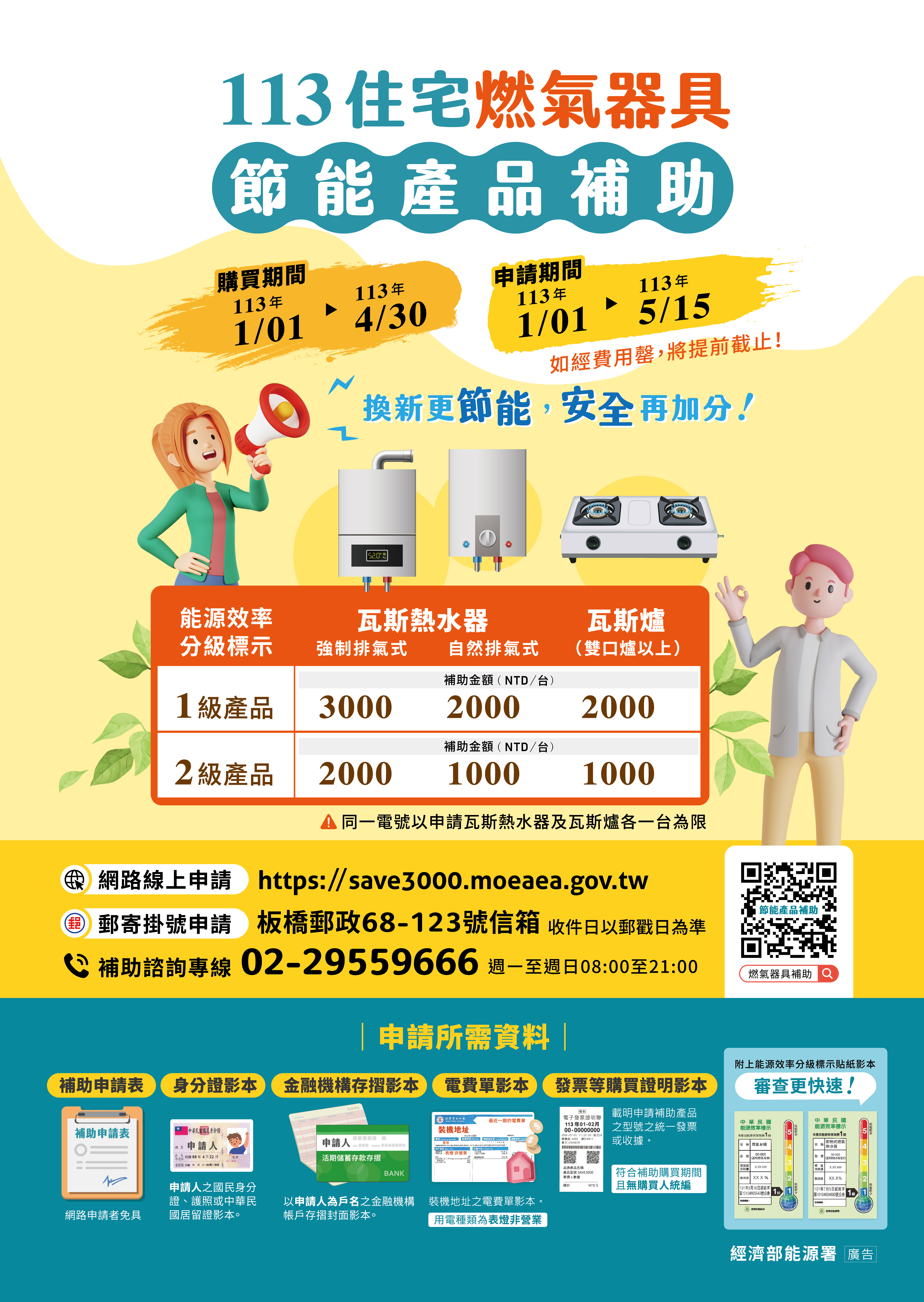經濟部自113年起全新推出「住宅燃氣器具節能產品補助」,凡購買一、二級能效瓦斯爐及瓦斯熱水器,每台最高可享3,000元補助