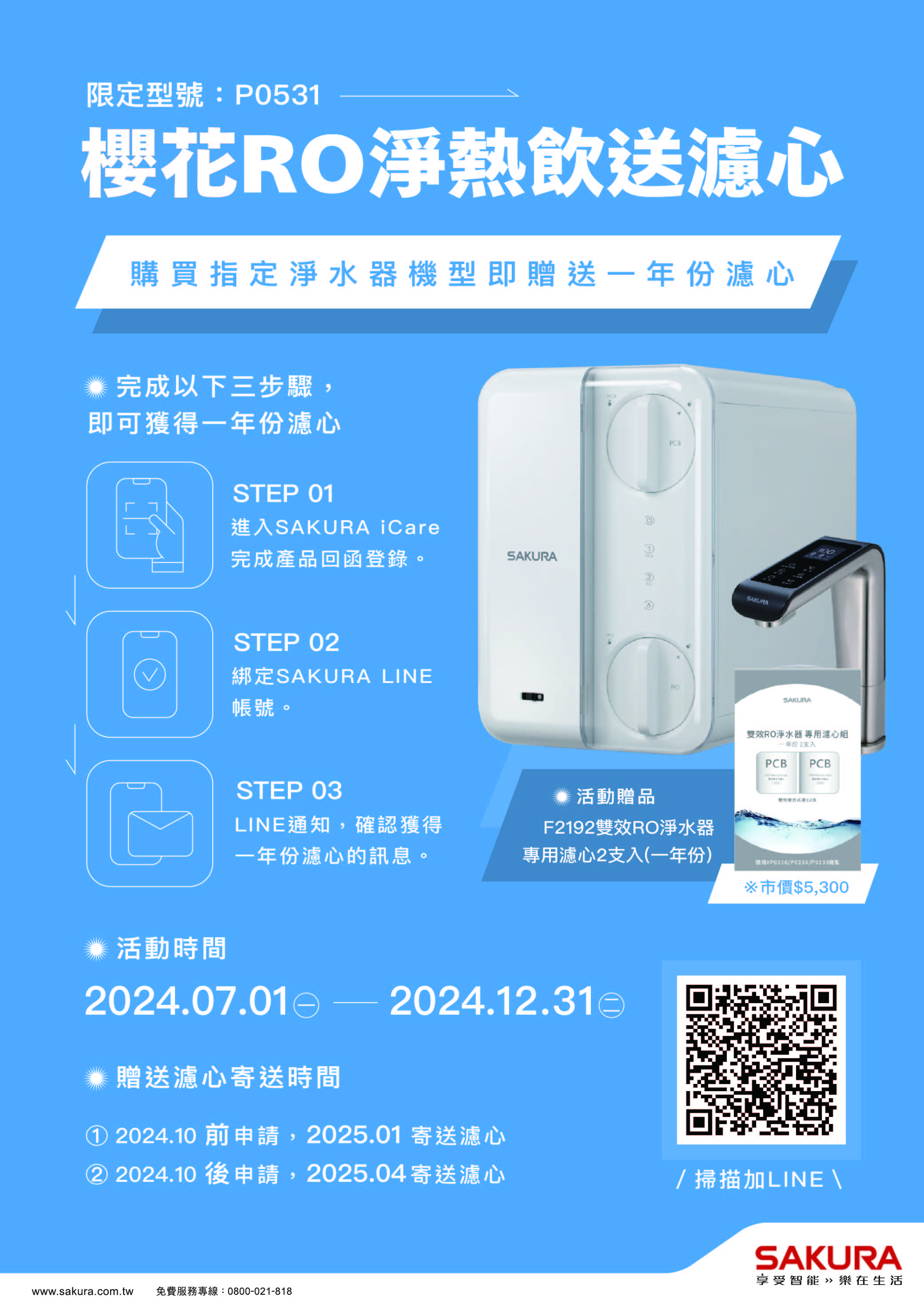 想要輕鬆獲得一年份濾心嗎?只要在活動期間內不限通路購買我們最新的櫻花廚下RO雙溫淨熱飲(型號:P0531),並完成產品回函登錄和LINE綁定,就能輕鬆獲得市價$5,300的一年份濾心哦!快來參與吧,讓我們一起迎接清新健康的新生活!