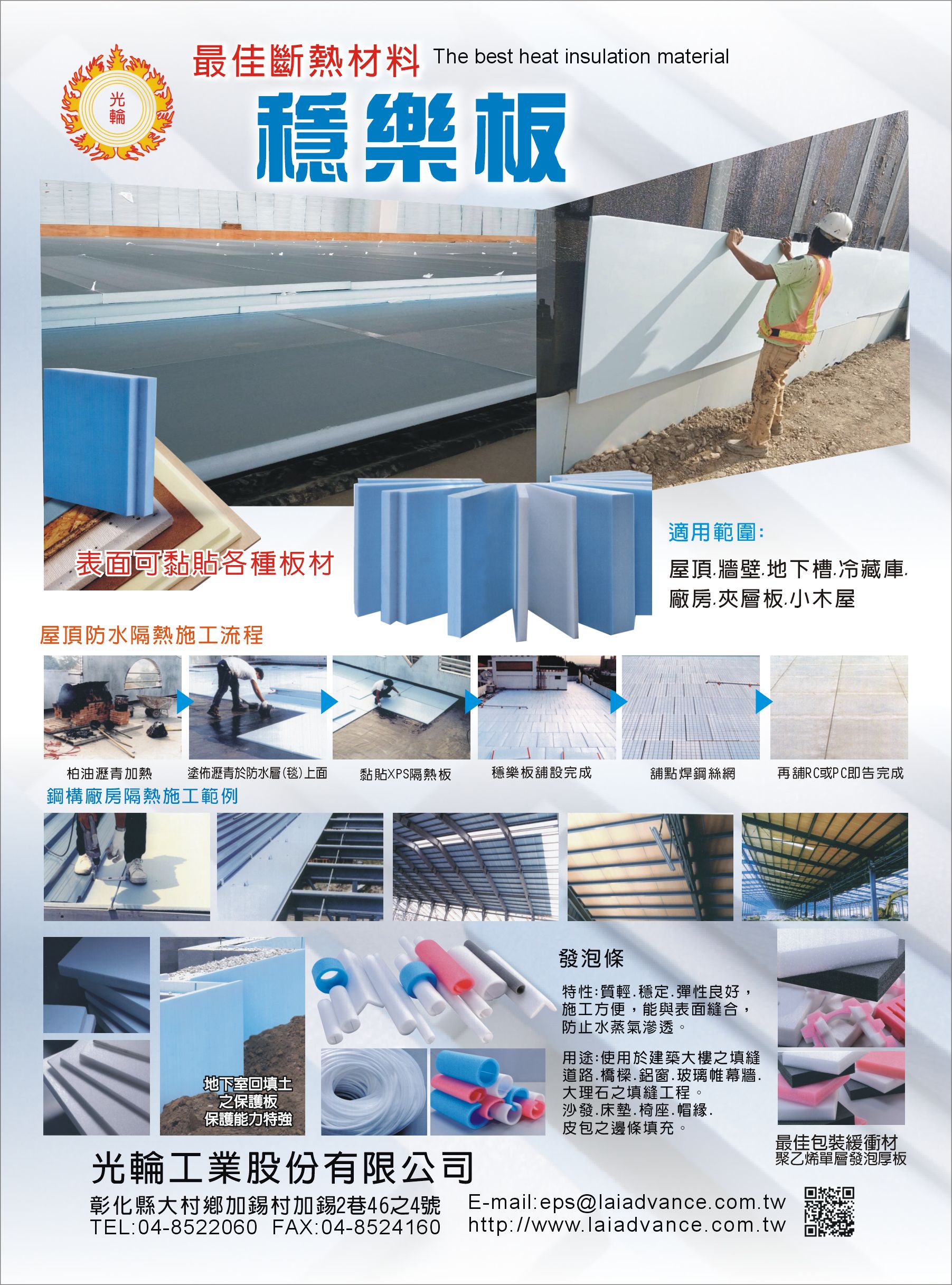 斷熱材料、穩樂板、PS板、XPS發泡隔熱板、PS隔熱板、PS隔熱磚、PE發泡管、發泡條、PE緩衝材、發泡板、屋頂防水隔熱、鋼構廠房隔熱、最佳斷熱材料、彰化穩樂板PS板、彰化斷熱材料、彰化發泡板、地下室回填土保護板、包裝緩衝材-EPE舒美布、EPE、聚乙稀單層厚板、屋頂、牆壁、地下槽、冷藏庫、商場、室內裝潢、夾層板、塗佈瀝青於防水層(毯)上面、可黏貼各種板材、PE舒美布、光輪、禹泰